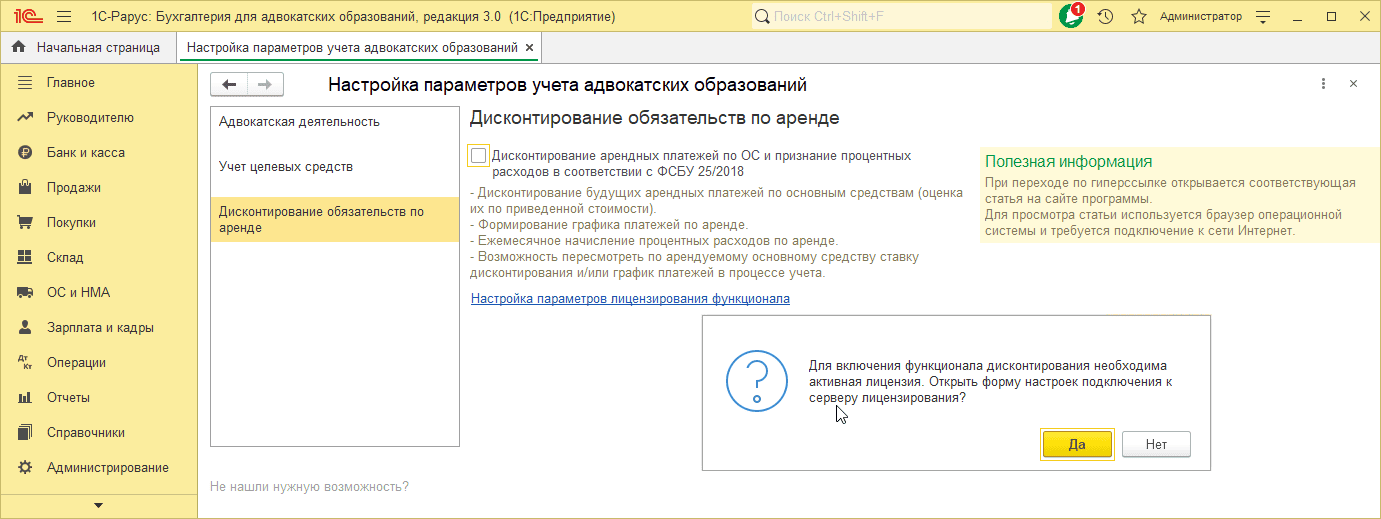 После получения лицензии повторно установите флаг «Дисконтирование арендных платежей по ОС и признание процентных расходов в соответствии с ФСБУ 25-2018» в настройке параметров учета: