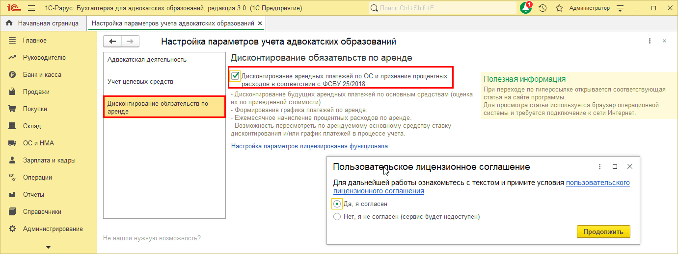 На вкладке «Дисконтирование обязательств по аренде» установите флаг «Дисконтирование арендных платежей по ОС и признание процентных расходов в соответствии с ФСБУ 25-2018» и примите условия Пользовательского лицензионного соглашения: