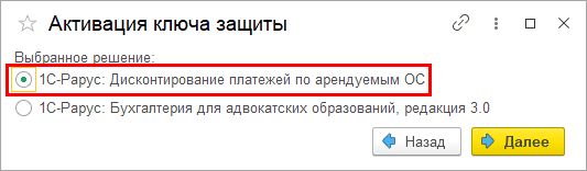 Выберите для активации решение «1С-Рарус: Дисконтирование платежей по арендуемым ОС»:
