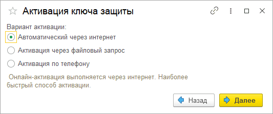 Выберите вариант активации «Автоматический через интернет»: