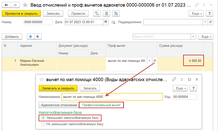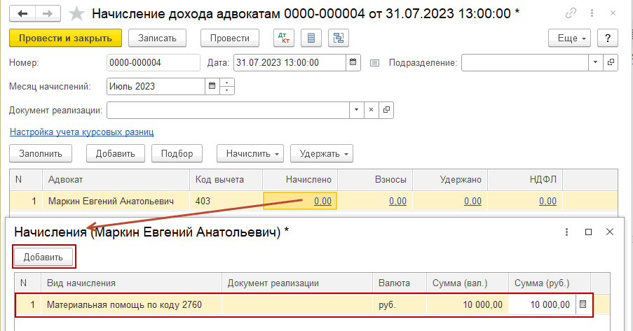 Рассмотрим, как произвести начисление материальной помощи адвокату с кодом дохода 2760.