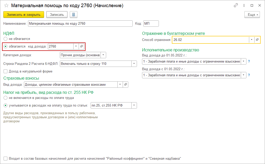 Для начисления материальной помощи адвокату в плане видов начислений (раздел Зарплата и кадры – Настройки зарплаты – раздел Расчет зарплаты – Начисления) создадим новый вид начисления – Материальная помощь по коду 2760:В разделе НДФЛ нужно установить переключатель в положение «облагается» и указать код дохода 2760 «Материальная помощь, оказываемая работодателями своим работникам, а также бывшим своим работникам, уволившимся в связи с выходом на пенсию».