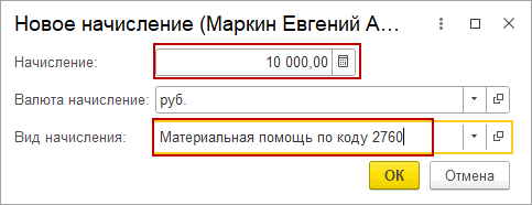 В открывшемся окне вводим сумму и выбираем ранее созданный вид начисления «Материальная помощь по коду 2760»: