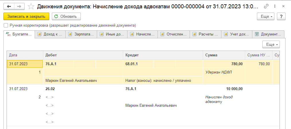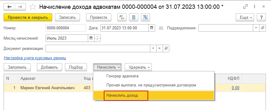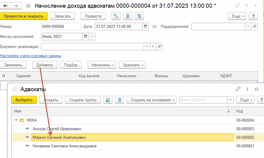 По кнопке Добавить в табличной части документа выберем адвоката: