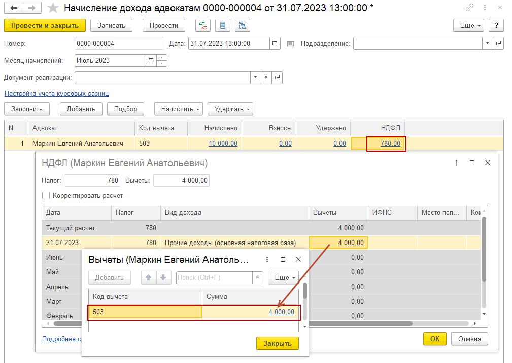 Проверим начисление НДФЛ. Видим, что применился вычет в 4000р, уменьшающий налогооблагаемую базу: