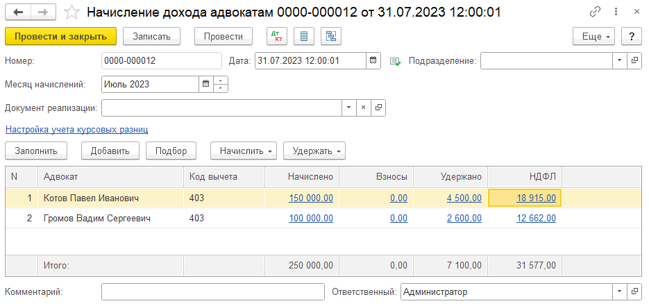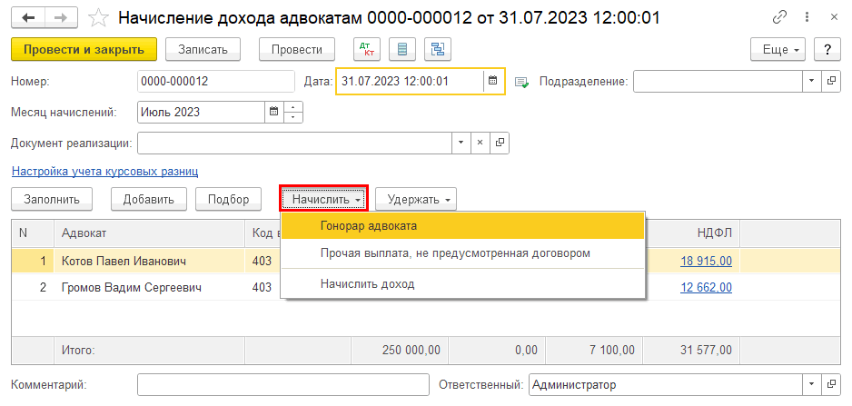После того как в программе отражено поступление вознаграждение от доверителя и оказание услуг, введены все необходимые отчисления, можно начислять гонорар с помощью документа «Начисление дохода адвокатам».