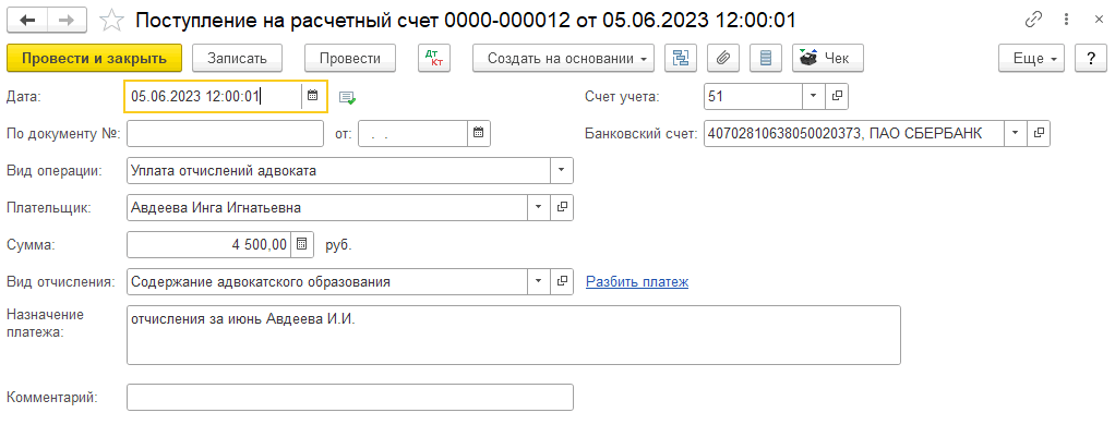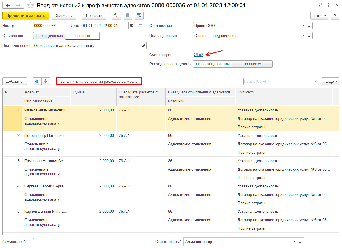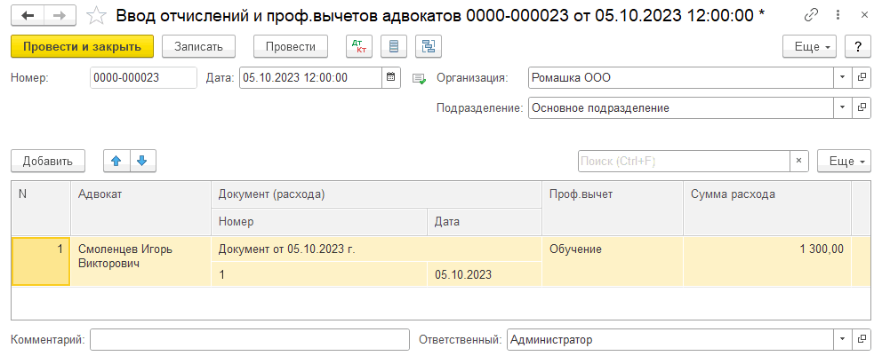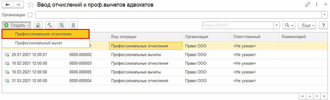 С необходимой периодичностью, например ежемесячно, создается документ «Ввод отчислений с адвокатов» с видом операции «Профессиональные отчисления».