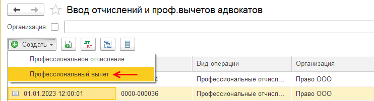 Для разовых отчислений либо отчислений, сумма которых меняется ежемесячно также создается документ «Ввод отчислений и проф.вычетов адвокатов» с видом операции «Профессиональное отчисление».