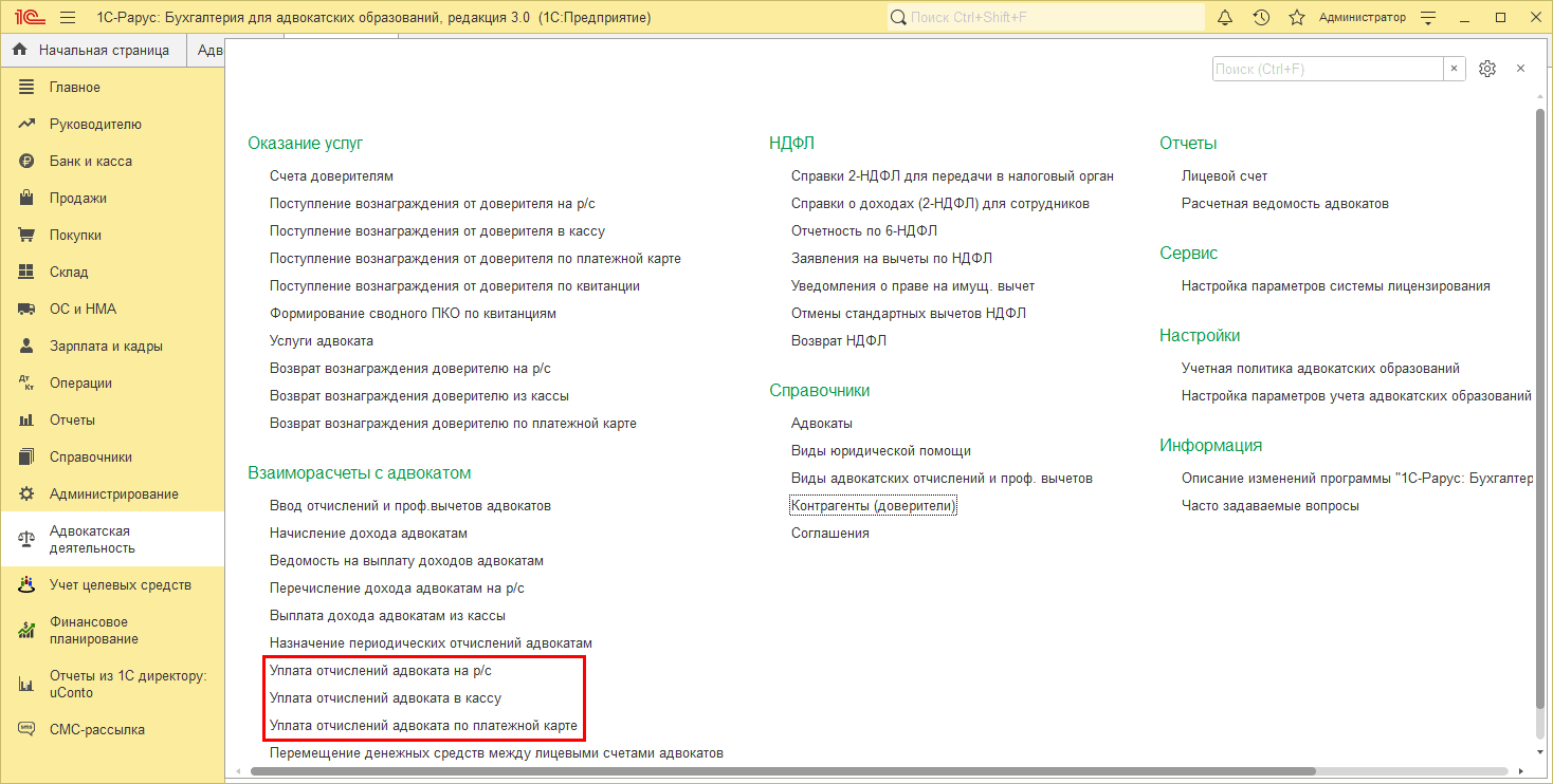 Помимо возможности вести бухучет добавлен функционал учета деятельности адвокатов, находится в разделе «Адвокатская деятельность».