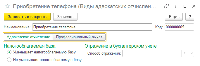 Для вида «Адвокатское отчисление» дополнительно можно указать способ отражения в бухгалтерском учете.