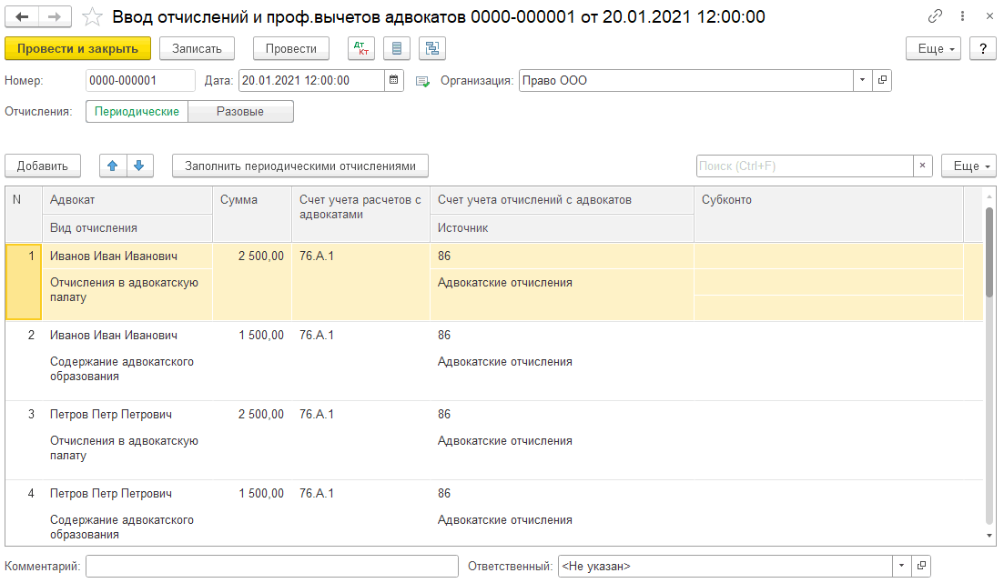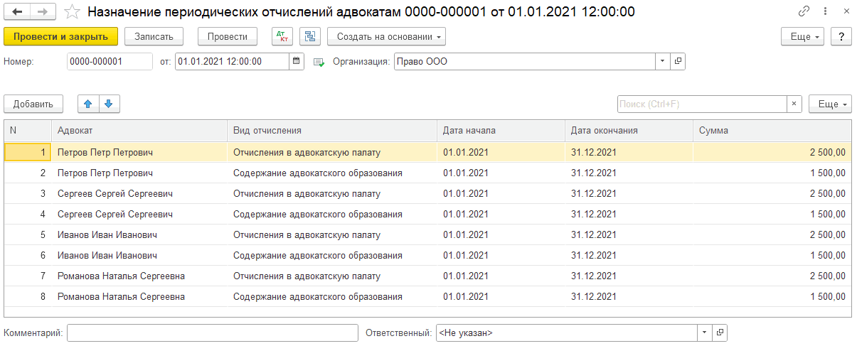 Создается документ «Назначение периодических отчислений адвокатам».