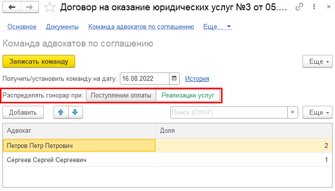 Услуги по соглашению могут оказываться одним адвокатом или командой из двух или более адвокатов. В этом случае нужно указать долю каждого из них в сумме выручки. Также можно выбрать, в какой момент будет распределяться сумма между адвокатами: сразу при поступлении средств от доверителя или после фактического оказания услуг.