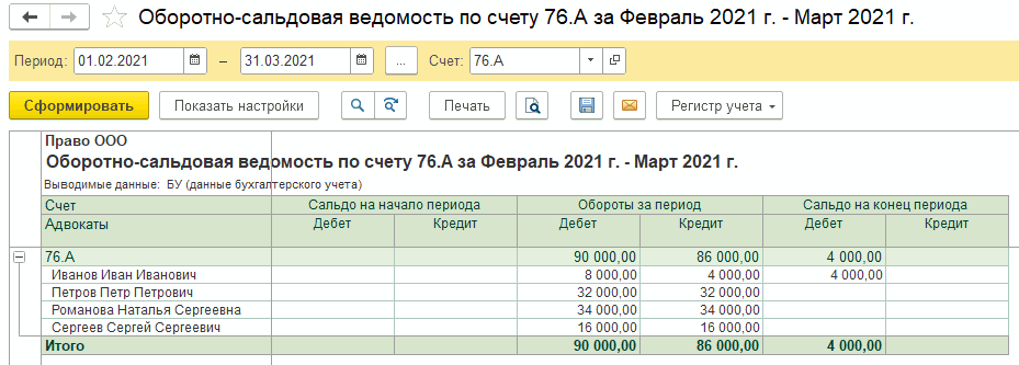 Взаиморасчеты с адвокатам ведутся на счете 76.А «Расчеты с адвокатами». У этого счета есть 2 субсчета: