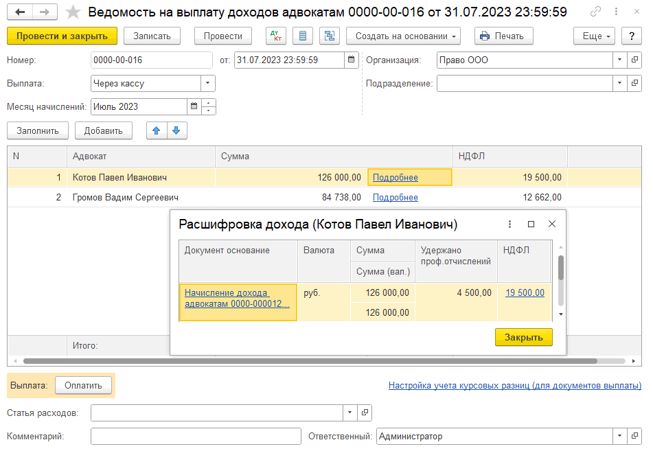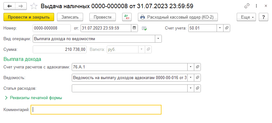 Выплатить гонорар можно через кассу или через банк. Для этого создаем документ «Ведомость на выплату доходов адвокатам», где также есть расшифровка расчета.