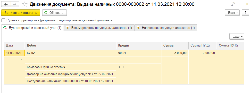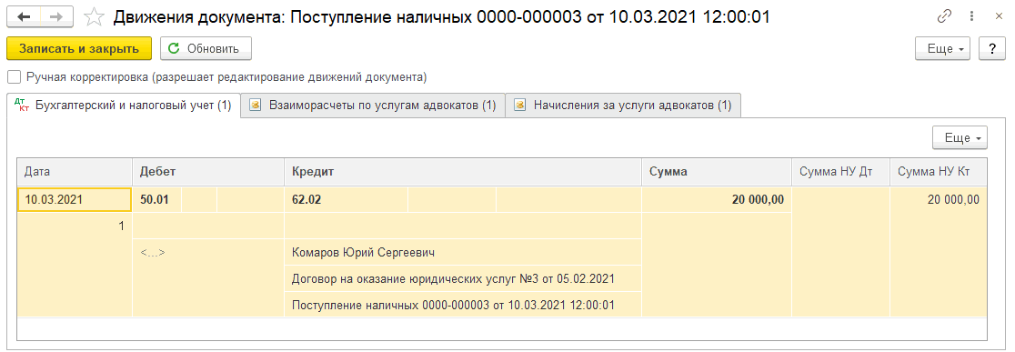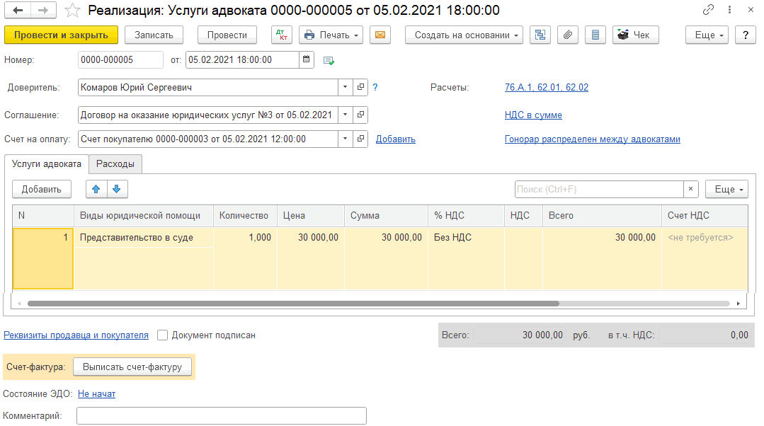 Для отражения факта оказания услуг доверителю используется документ «Услуги адвоката».