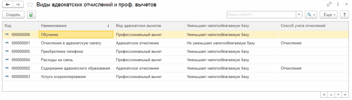 Адвокаты осуществляют профессиональные расходы: на общие нужды адвокатской палаты, содержание адвокатского образования, страхование профессиональной ответственности и иные расходы, непосредственно связанные с извлечением дохода от адвокатской деятельности. Адвокаты вправе уменьшить налогооблагаемую базу по налогу на доходы физических лиц на сумму фактически произведенных ими и документально подтвержденных расходов, непосредственно связанных с осуществлением профессиональной адвокатской деятельности. В программе реализован учет таких расходов. Профессиональные расходы хранятся в справочнике «Виды адвокатских отчислений и проф.вычетов».