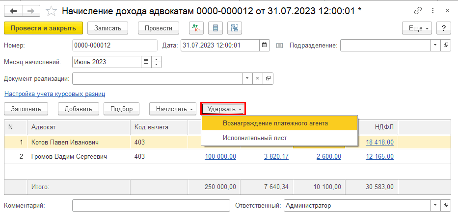 В документе указываются адвокаты и отчисления, которые необходимо удерживать. Вводится дата начала и дата окончания периода, в который будет производиться удержание отчислений.