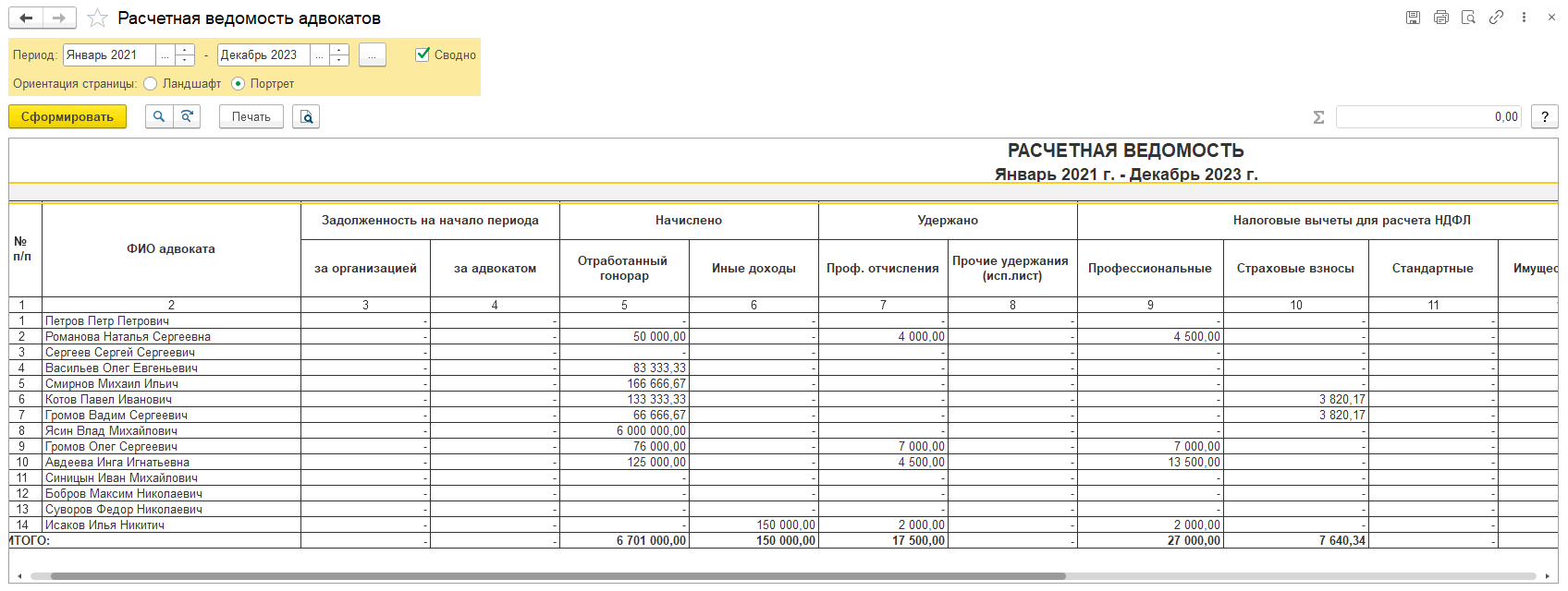 В отчете «Расчетная ведомость адвоката» можно увидеть информацию по задолженности на начало периода, начисленным и удержанным суммам, налоговым вычетам и суммам НДФЛ, уже выплаченным суммам за период и итоговой сумме к выплате.