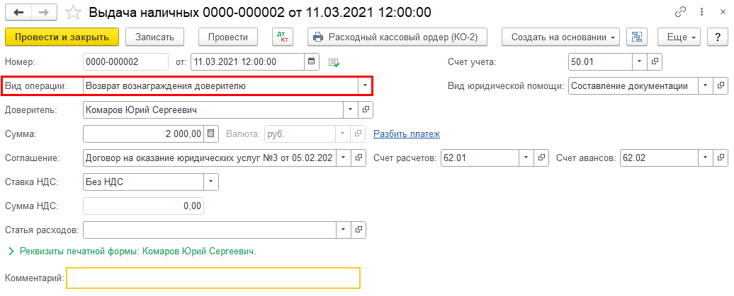 Если стоимость оказанных услуг оказалась меньше оплаченной доверителем, остаток можно вернуть клиенту документом «Возврат вознаграждения доверителю».