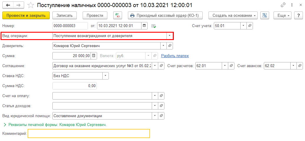 Пример документа «Поступление вознаграждения от доверителя в кассу».