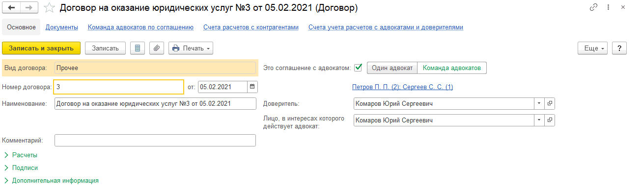 Для доверителей, которым оказываются юридические услуги, оформляется специальное соглашение (договор). Соглашения хранятся в справочнике «Договоры».