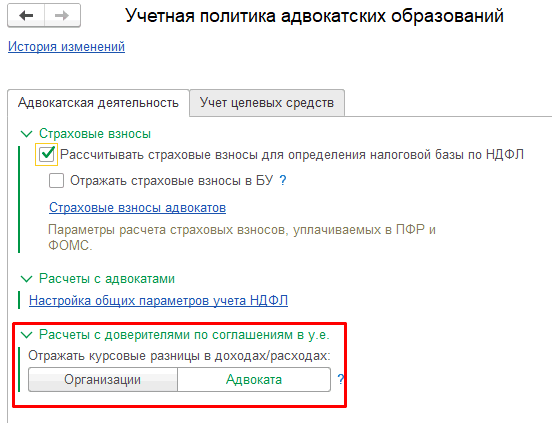 Возможно два варианта отражения возникающих курсовых разниц, настройка задается в Учетной политике адвокатских образований в разделе «Расчеты с доверителями по соглашениям в у.е»: