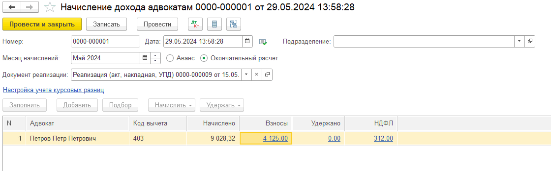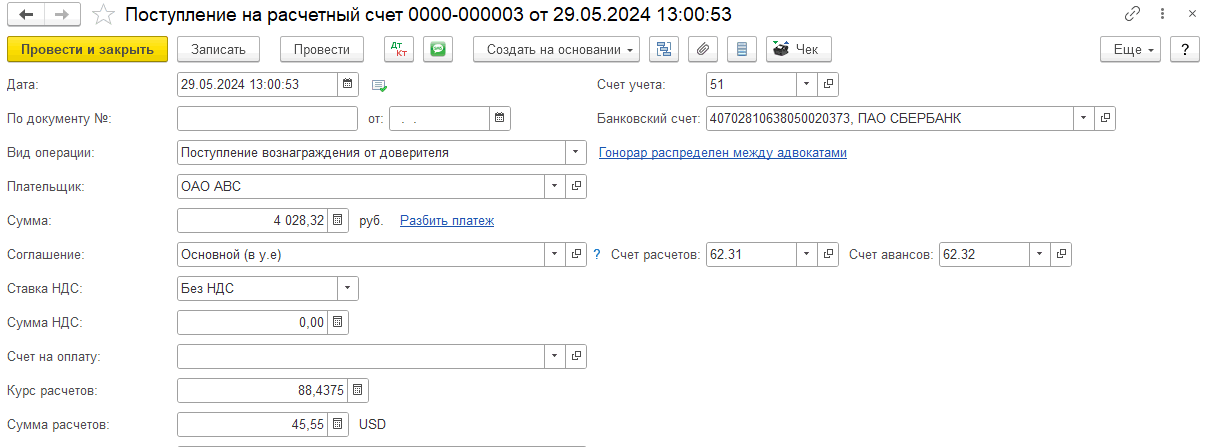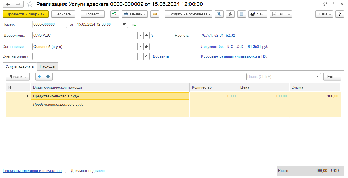 Отразим оказание услуг доверителю. Поскольку стоимость услуг в соглашении установлена в у.е. (USD), документ «Реализация (Услуги адвоката)» также заполняется в у.е. (USD).