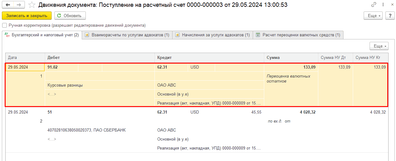 Если выбран вариант отражения курсовых разниц в доходах/расходах организации, то при возникновении курсовых разниц формируется проводка по счету учета доходов/расходов адвокатского образования: