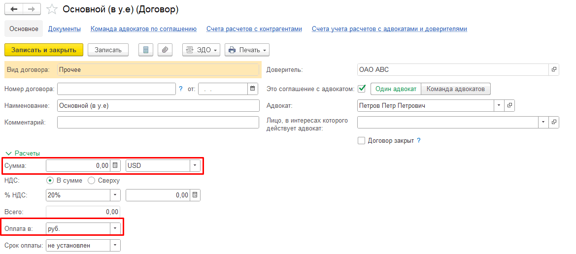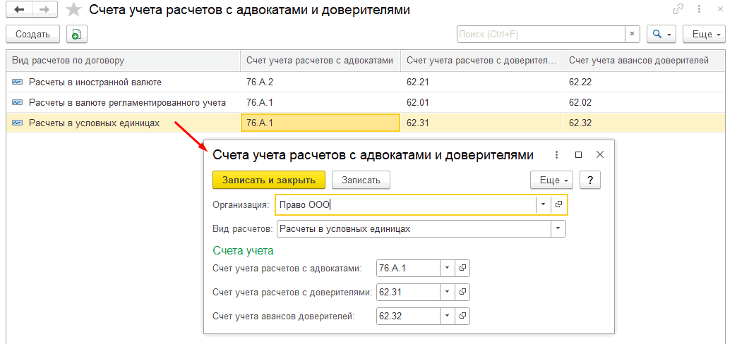 При учете с доверителями возможна ситуация, когда расчеты производятся в рублях, но в соглашении указывается валютная сумма. Такие соглашения должны оформляться в условных единицах (у.е). Рассмотрим, как ведется учет в таком случае в программе 1С-Рарус: Бухгалтерия для адвокатских образований.