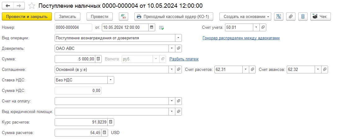 Оформим поступление денежных средств от доверителя (аванса) в кассу: