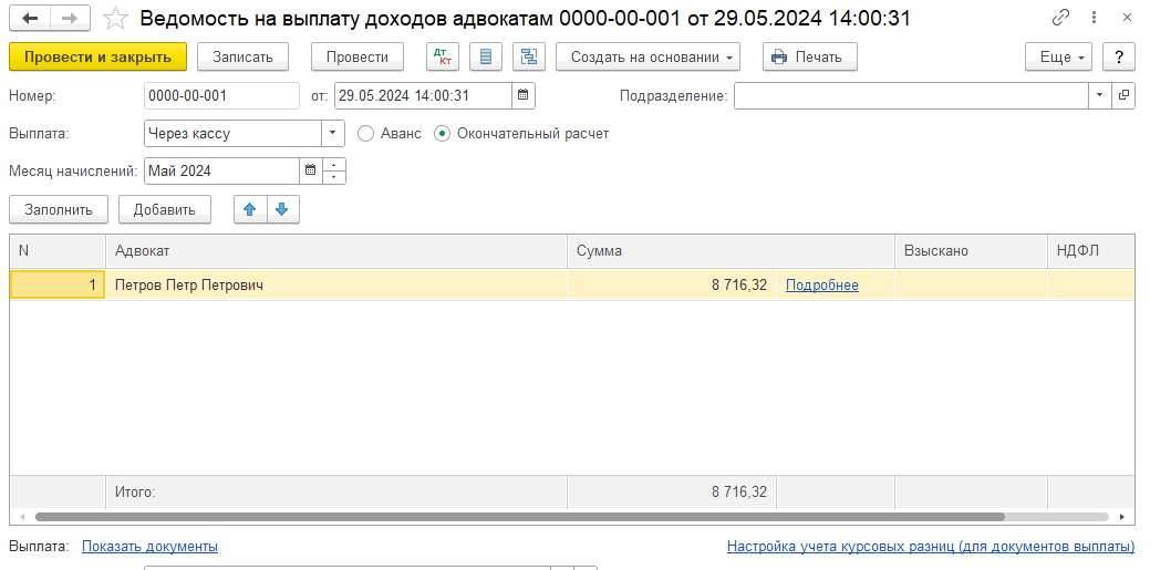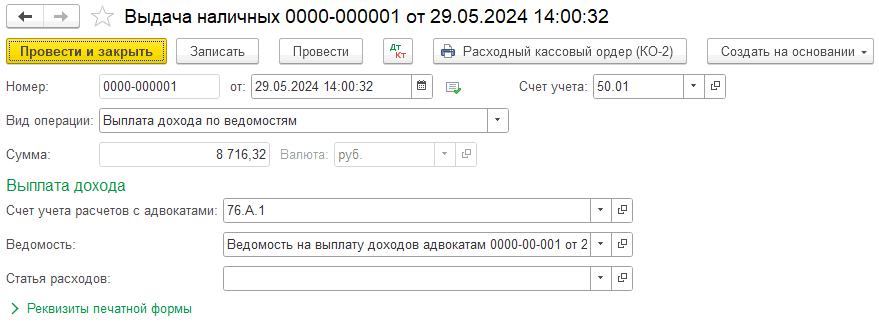 Отразим выплату дохода адвокату. При этом выплата производится также в рублях (со счетов 50.01 или 51):
