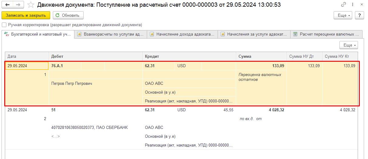 Если выбран вариант отражения курсовых разниц в доходах/расходах адвоката, то формируется проводка по счету учета расчетов адвокатов с доверителями (76.А.1) и на конкретного адвоката (или команду адвокатов), указанного в соглашении. Счета настраиваются в Настройке параметров учета учета адвокатских образований: