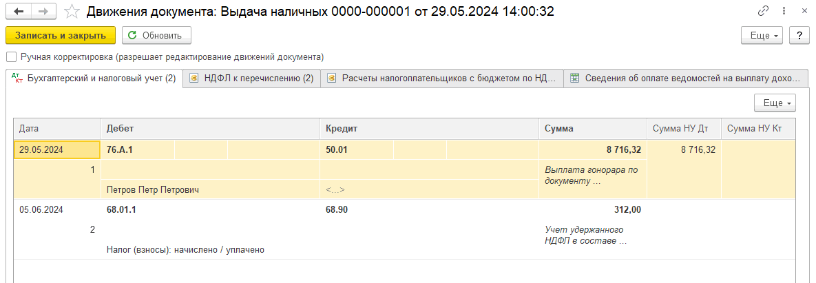 В результате проведения документа «Поступление на расчетный счет» будут сформированы проводки: