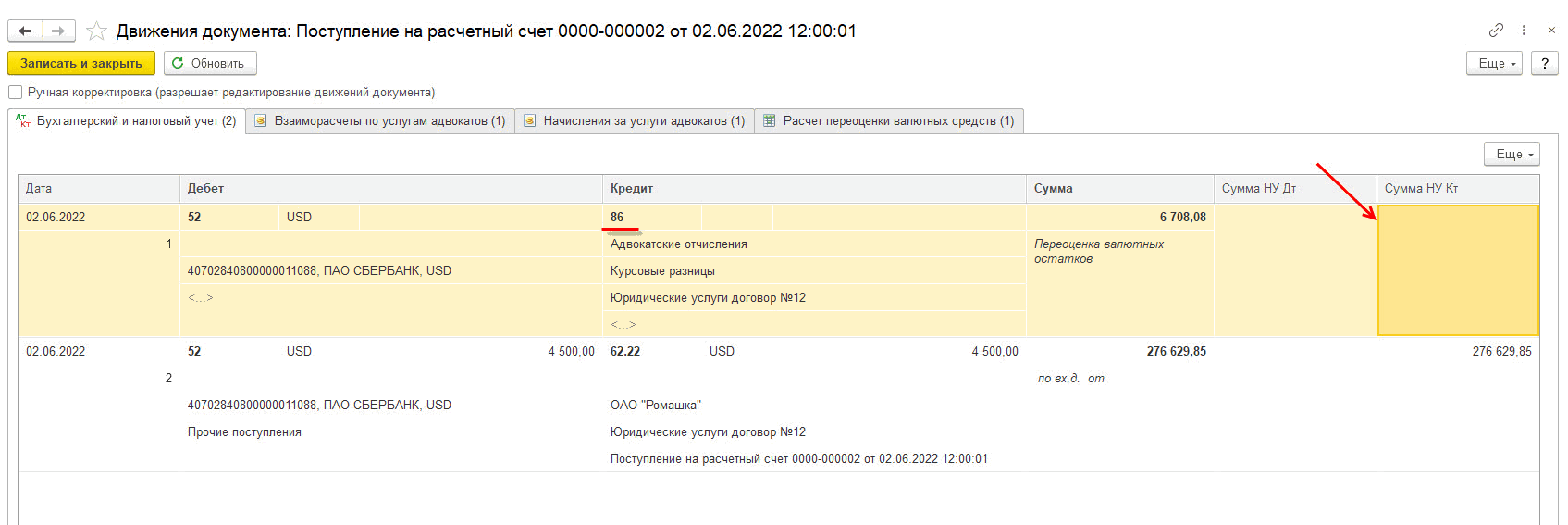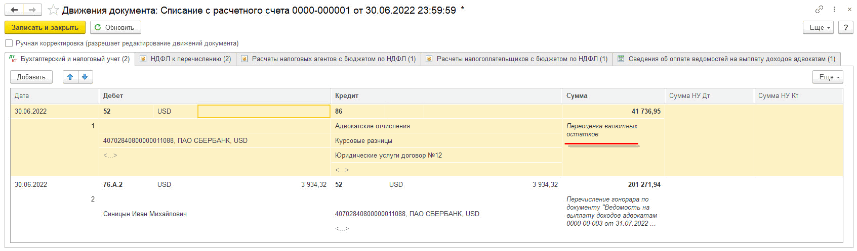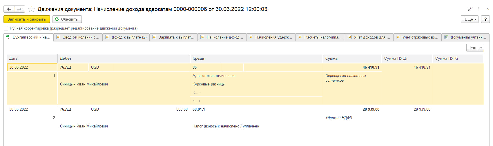 Разницу в сумме также можно наблюдать в проводках документа Начисление дохода адвокатам (ДтКт).