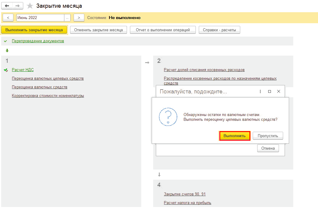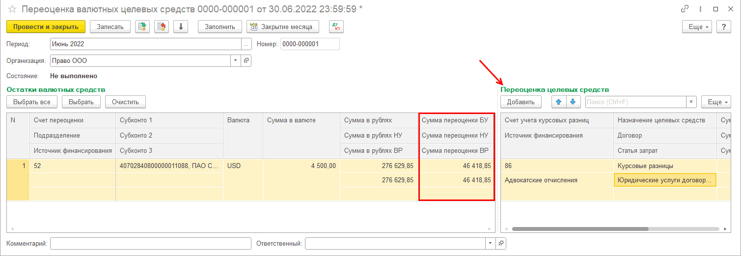 Табличная часть автоматически заполнена остатками валютных средств за текущий месяц. В случае, если необходимо указать переоценку целевых средств, суммы, не учитываемые в НУ указываем вручную. Сохраняем настройки и выполняем закрытие месяца: