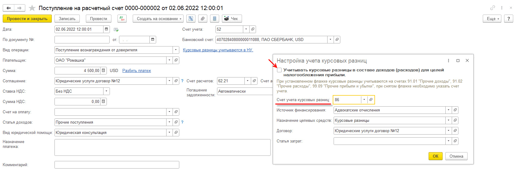 В начислении гонорара по ссылке «Настройка учета курсовых разниц» можно узнать, на какой счет они будут отражаться. Как правило, адвокатские образования являются некоммерческими и отражают всё на 86 счете: