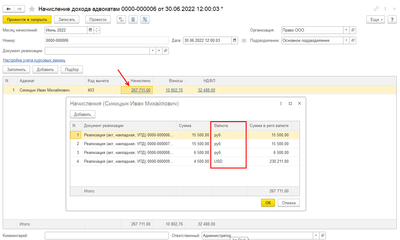 Начислять гонорар также можно одним документом, не указывая конкретный документ Реализации (Услуги адвоката) по кнопке «Заполнить», в этом случае в расшифровке начисления будут указаны документы реализации и в руб, и в валюте, и дальнейшие выплаты можно будет формировать одной ведомостью: