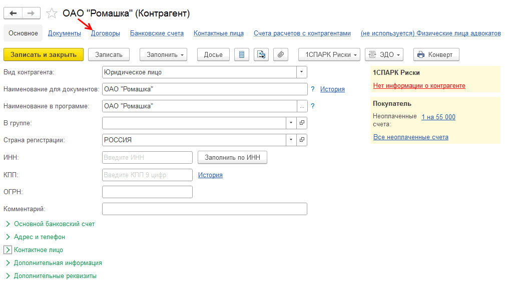 Создадим контрагента и соответствующее соглашение в валюте (меню «Справочники» – «Контрагенты»):