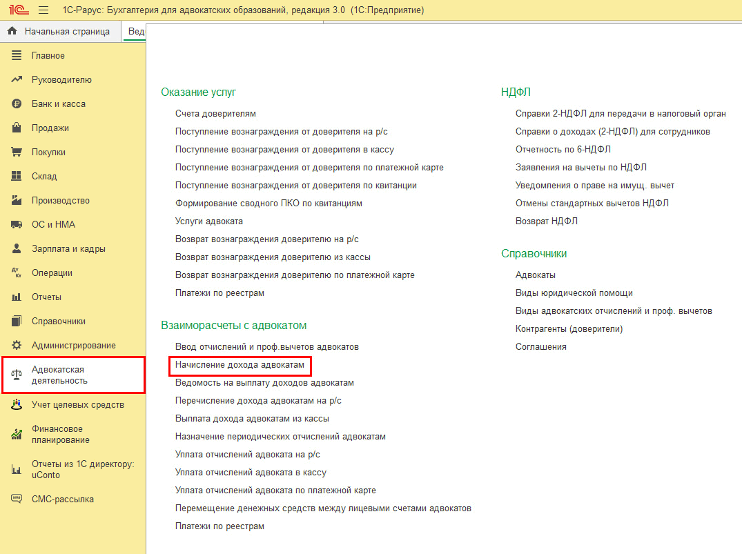 или с помощью документа «Начисление дохода адвокатам» (меню «Адвокатская деятельность» – «Начисление дохода адвокатам»):