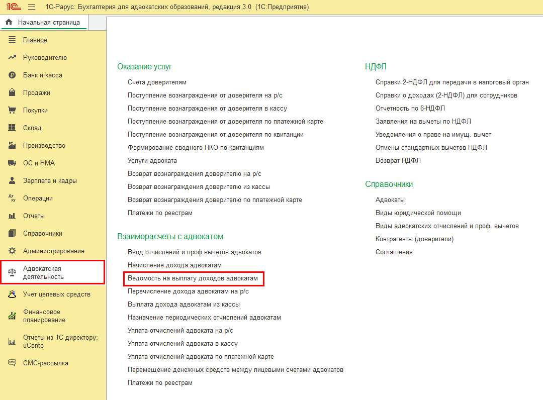 После начисления гонорара его нужно выплатить (меню «Адвокатская деятельность» – Ведомость на выплату доходов адвокатам):