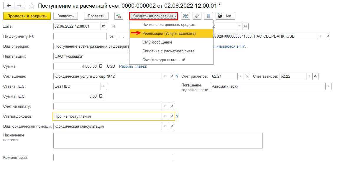 На основании поступления денежных средств от доверителя можно создать документ Реализация (Услуги адвоката):