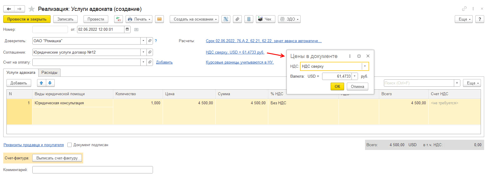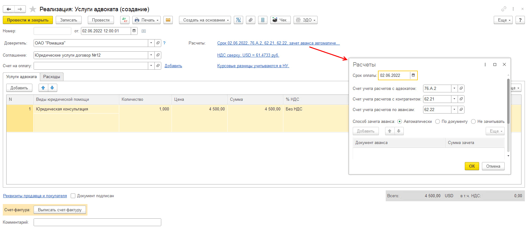 В документе Реализация (Услуги адвоката) настроенные ранее счета учета расчетов с адвокатами и заполняются автоматически: