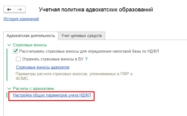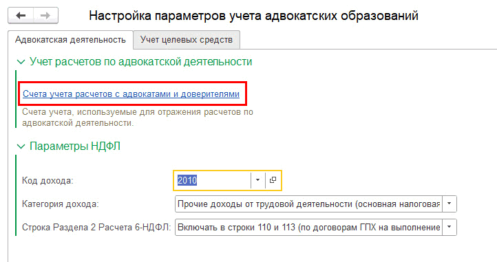 Закладка «Адвокатская деятельность» – Настройка общих параметров учета НДФЛ – Счета учета расчетов с адвокатами и доверителями: