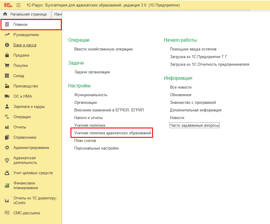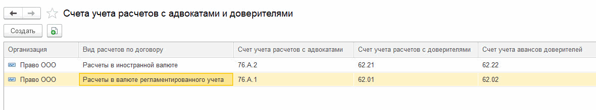 В программе доступна настройка счетов расчетов с адвокатами и доверителями, в том числе валютных счетов (меню «Главное» – «Учетная политика адвокатских образований»):