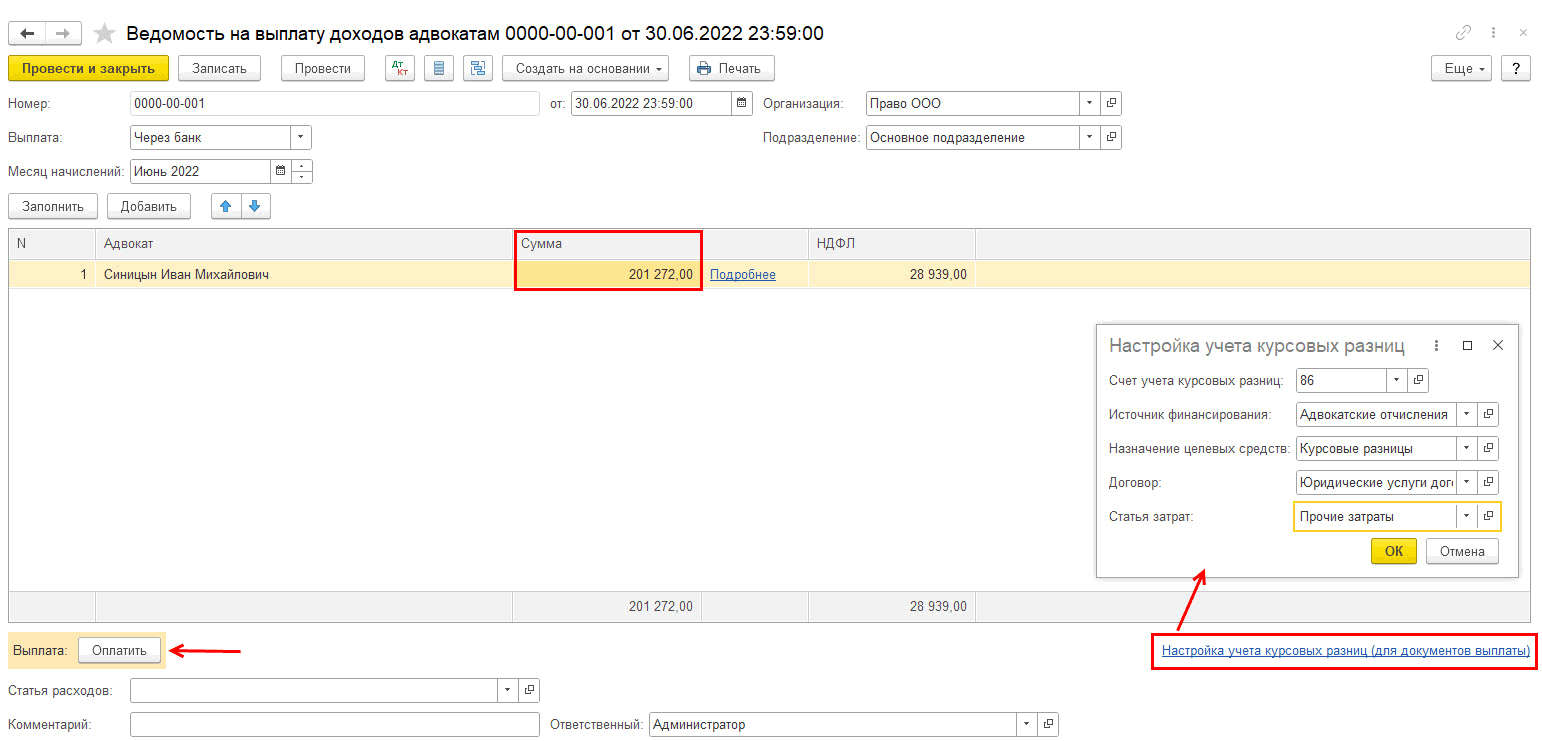 В программе 1С-Рарус: Бухгалтерия для адвокатских образований гонорар в валюте необходимо выплатить именно в тот день, когда был начислен доход.