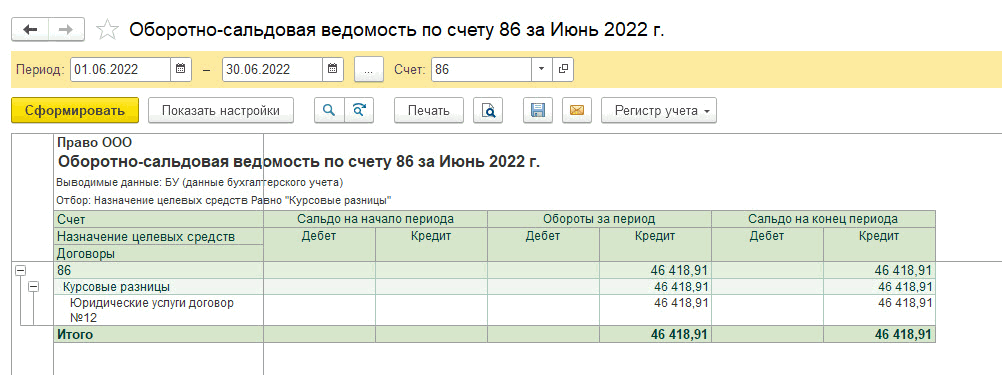 Для отслеживания оборота денежных средств по курсовым разницам сформируем оборотно-сальдовую ведомость за период по 86 счету с отбором назначения – Курсовые разницы, например, в разрезе договоров: