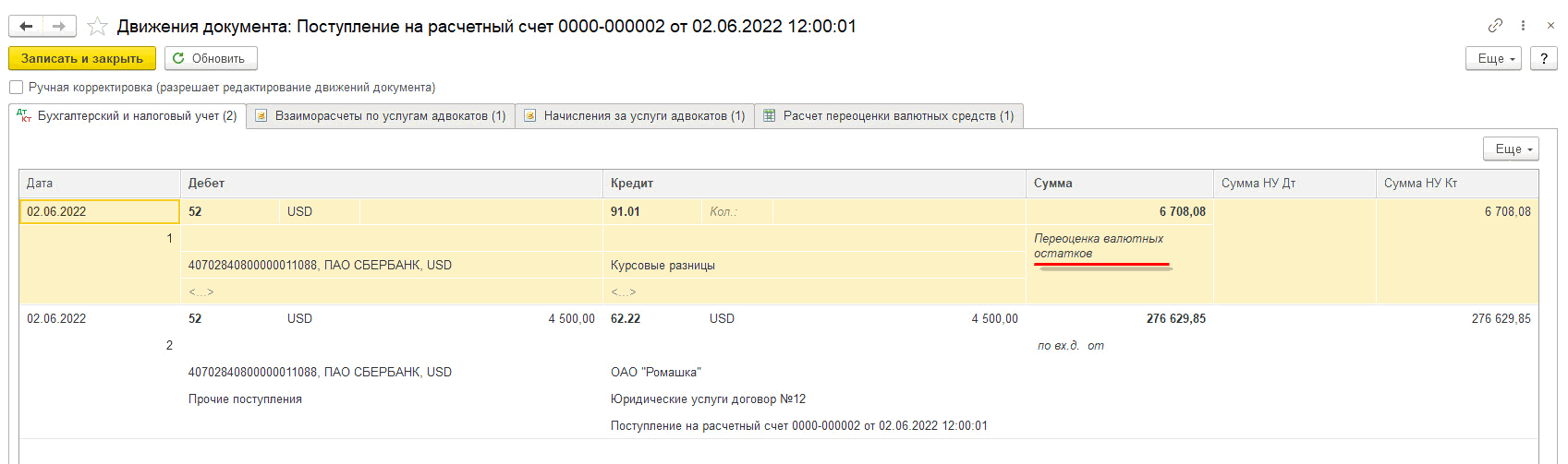 В проводках документа Начисление дохода (ДтКт) можно увидеть курсовые разницы и они отражаются за счет адвокатского образования. То есть, если курс увеличился, то это расход организации, если курс уменьшился, то доход: