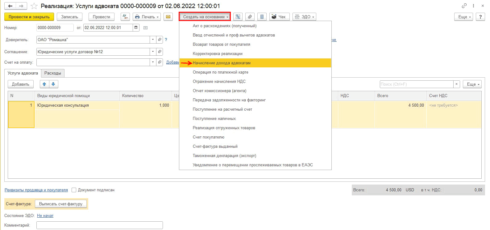 Начислим гонорар на основании документа Реализация (Услуги адвоката):
