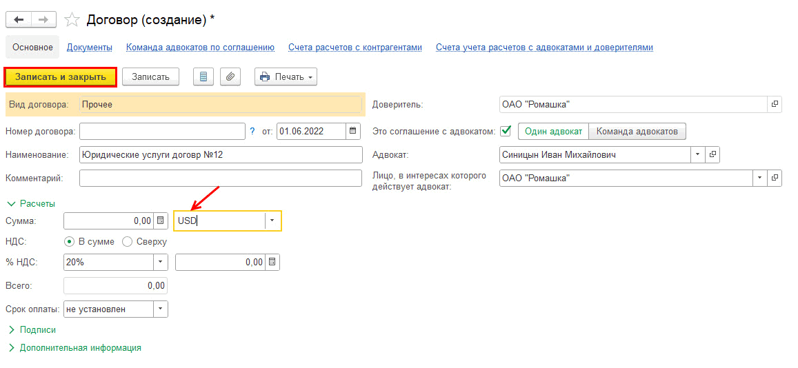 Создадим договор (соглашение) с одним адвокатом: