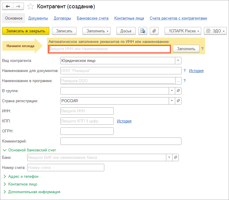 В сервисе также имеется возможность массовой отправки приглашений по выбранному списку получателей. Если список не полный, то в программе присутствует возможность создать и заполнить карточку контрагента по ИНН или Наименованию при помощи сервиса 1С:Контрагент.